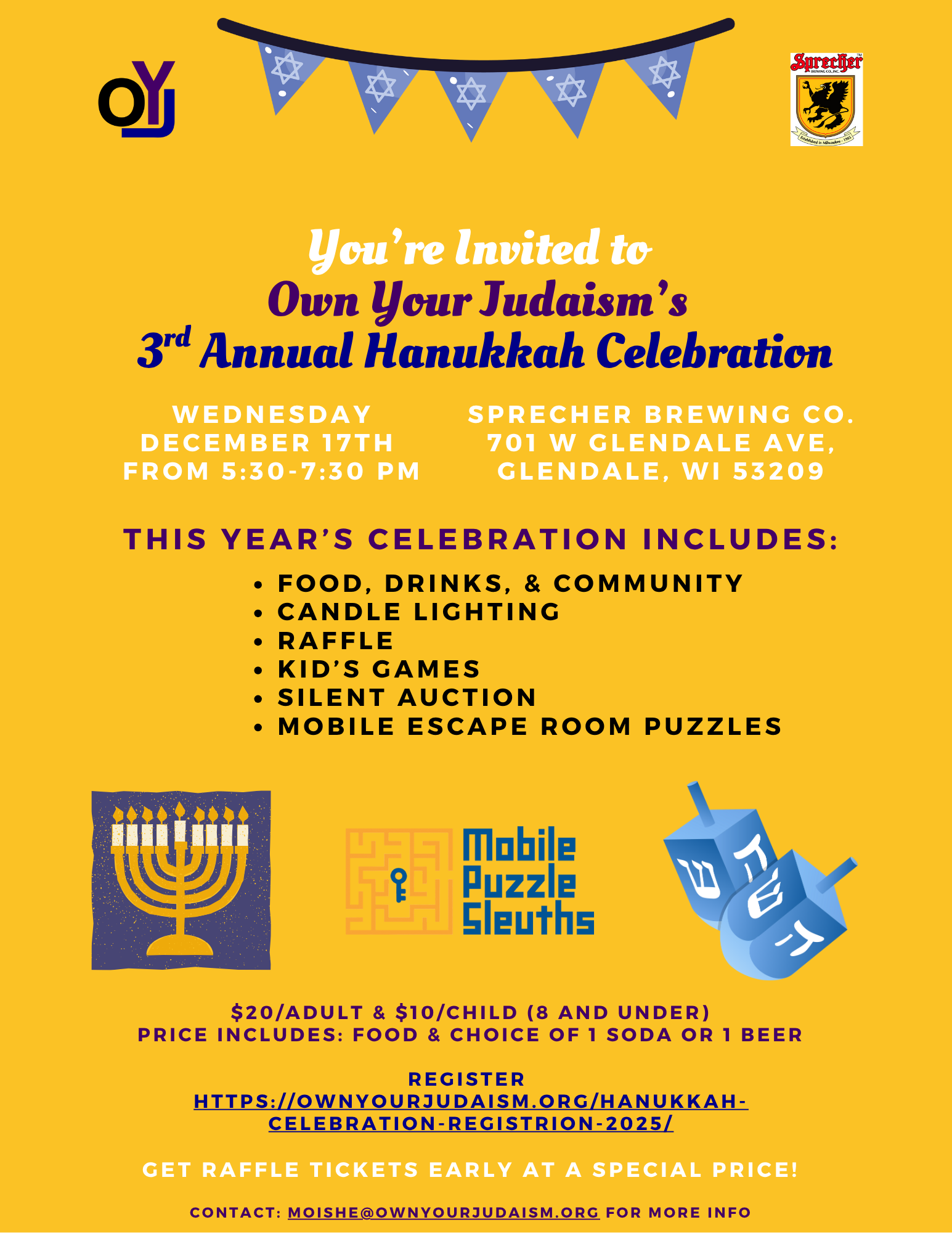 It’s almost time for OYJ’s 3rd Annual Hanukkah Celebration. We are excited to once again host the event at Sprecher Brewing Company on Wednesday, December 17, 2025 from 5:30pm until 7:30pm. We will celebrate with food, drink, and community, while lighting the candles. We will have kids games, mobile escape room puzzles ( provided by Mobile Puzzle Sleuths), raffle prizes, and a silent auction. To get your tickets, simply click HERE to jump over to our registration form. OYJ is excited to celebrate with you!