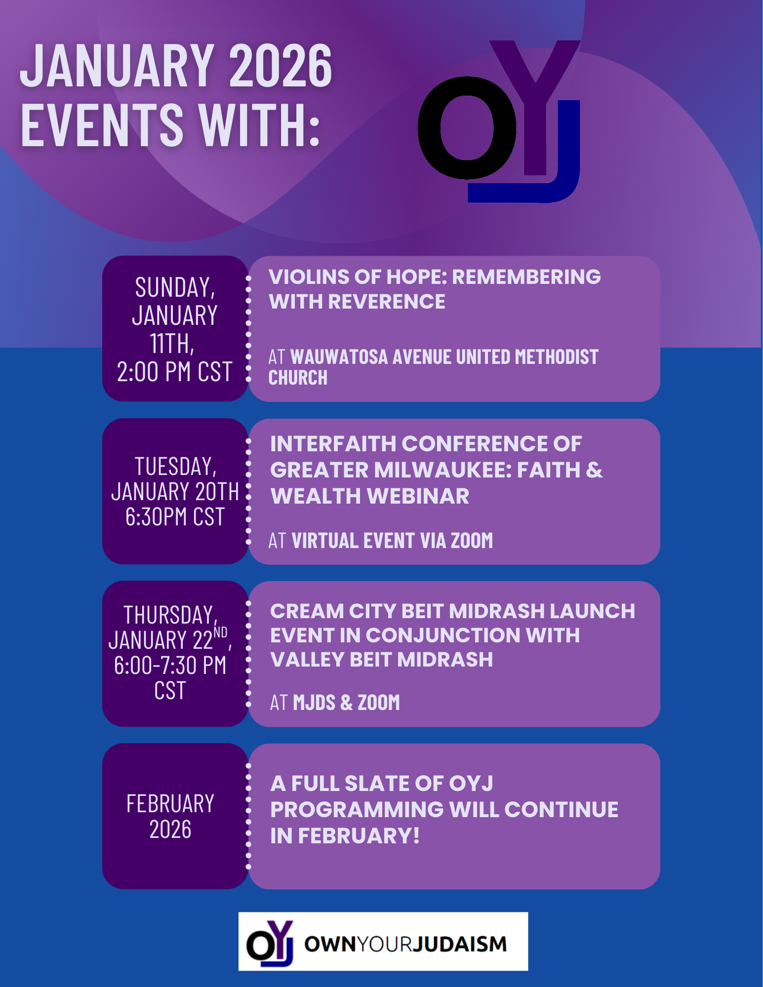 OYJ is proud to present and co-present these upcoming events and programs in January 2026. We have Violins of Hope: Remembering with Reverence on January 11, 2026, Interfaith Conference of Greater Milwaukee: Faith & Wealth...