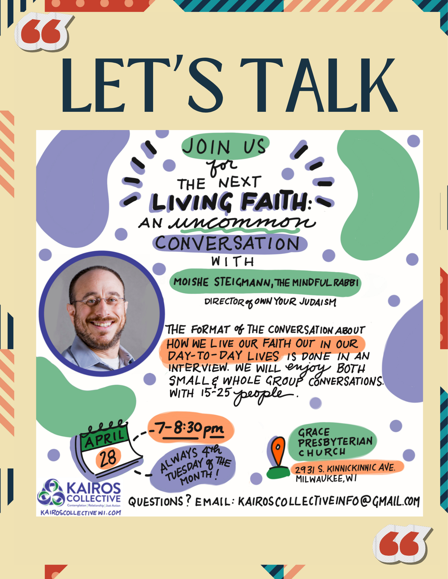 “An uncommon conversation with Moishe Steigmann, The Mindful Rabbi, Director of Own Your Judaism. The format of the conversation about how we live our faith in our day-to-day lives is done in an interview. We will enjoy both small and whole group conversations.”