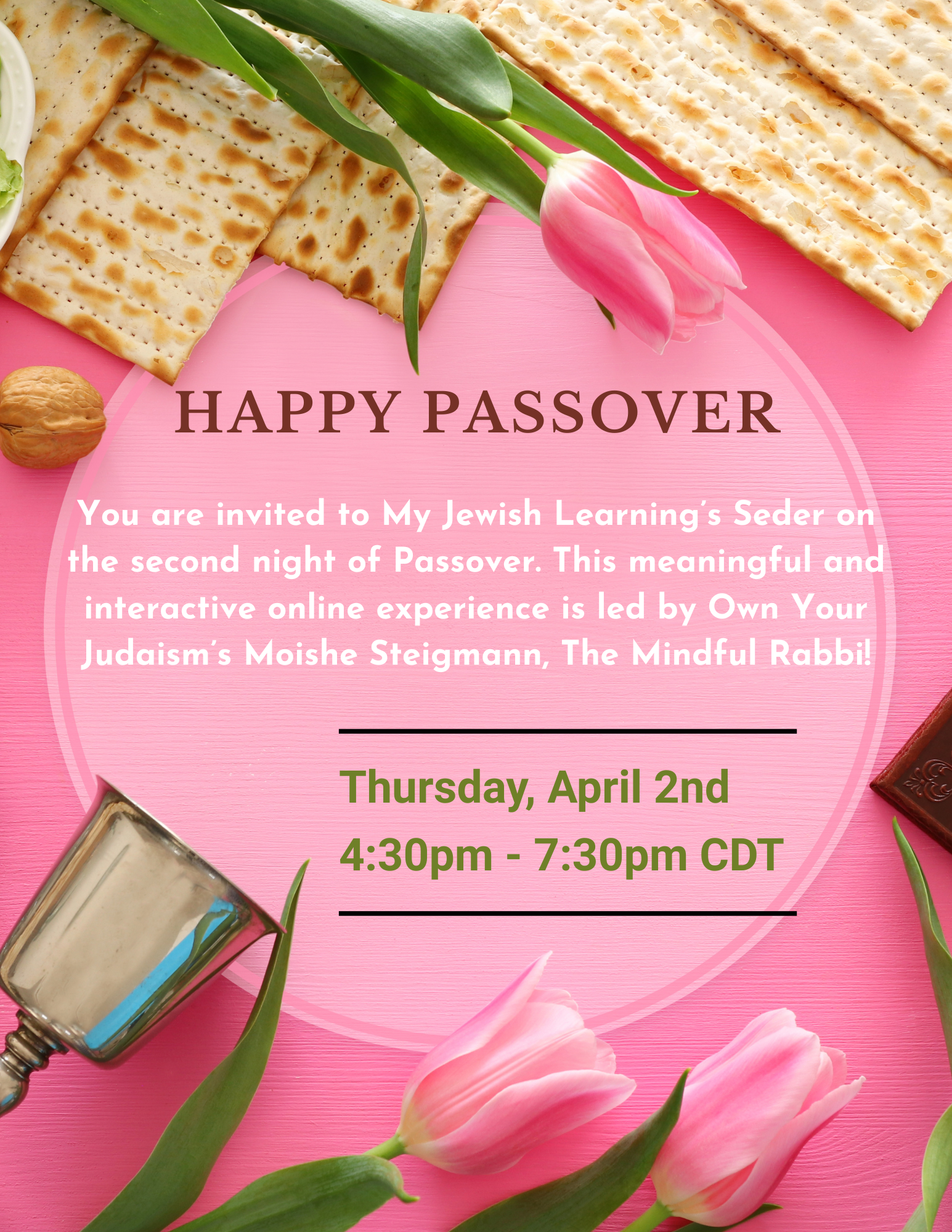 You’re invited to the My Jewish Learning Seder on the second night of Passover (Thursday, April 2nd from 4:30pm to 7:30pm CDT)!