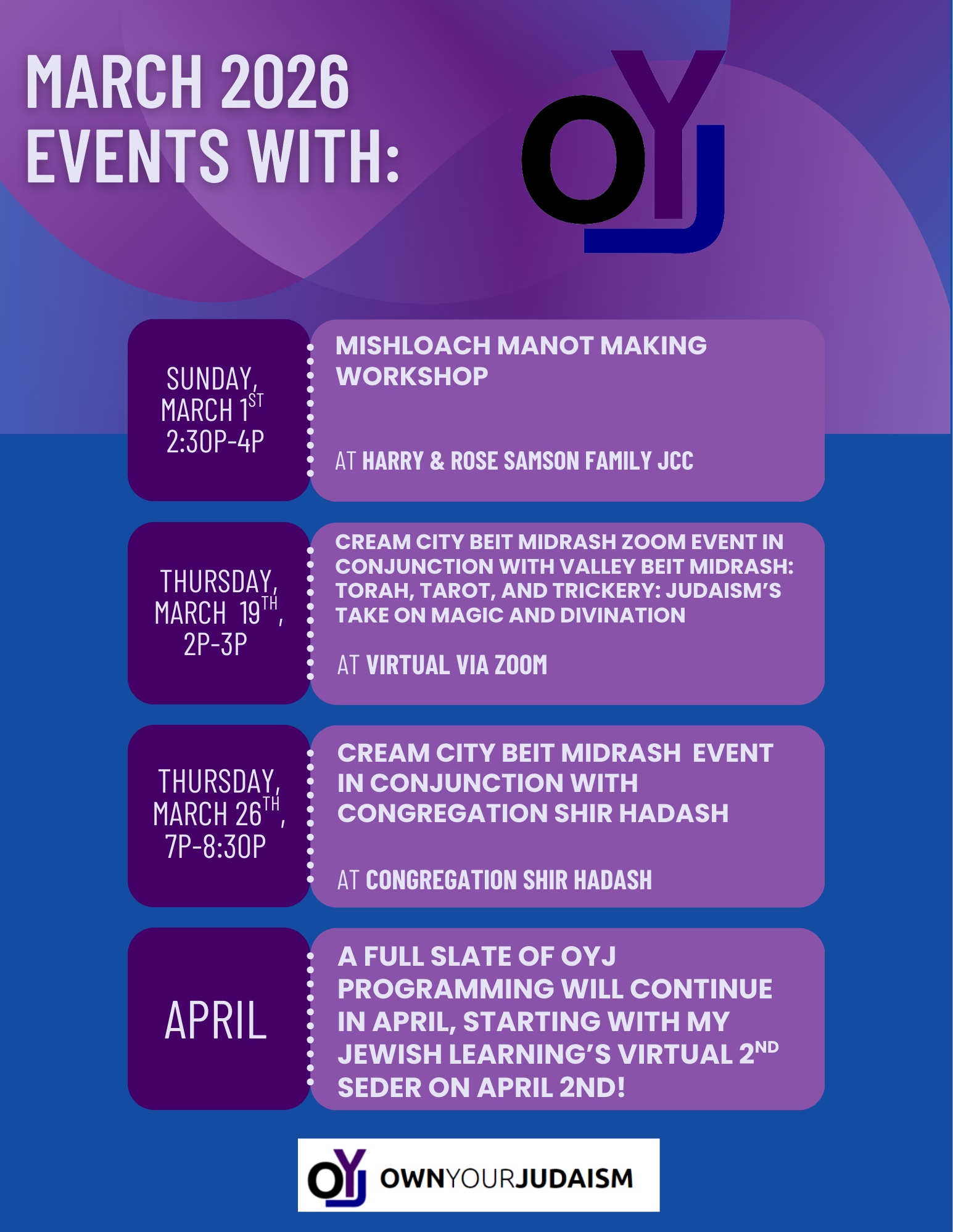 OYJ is proud to present and co-present these upcoming events and programs in March 2026. We have our 1stAnnual Mishloach Manot Making Workshop on Sunday, March 1st, Cream City Beit Midrash Zoom Event (Torah, Tarot, and Trickery: Judaism’s Take On Magic And Divination) in conjunction with Valley Beit Midrash on Thursday, March 19th, and another Cream City Beit Midrash Event (An Unfinished Freedom: Passover as the Birth of an Ideal) both in person and via Zoom in conjunction with and hosted by Congregation Shir Hadash.