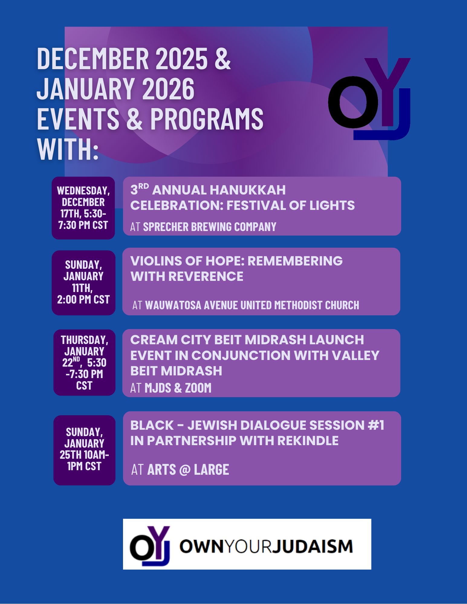 OYJ is proud to present and co-present these upcoming events and programs in December of 2025 and into January 2026. We have the 3rd annual Hanukkah Celebration at Sprecher Brewing Company on December 17, 2025, Violins of Hope: Remembering with Reverence on January 11, 2026, the Launch Event of Cream City Beit Midrash in conjunction with Valley Beit Midrash on January 22, 2026, and Session #1 of Black-Jewish Dialogue in partnership with Rekindle Fellowship.