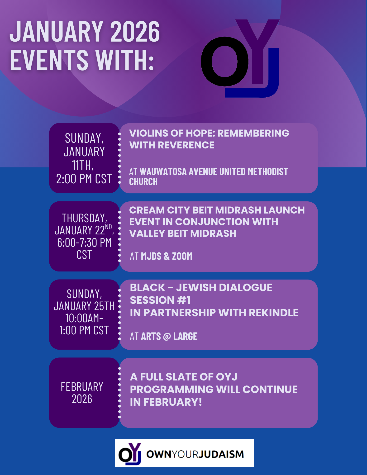 OYJ is proud to present and co-present these upcoming events and programs in January 2026. We have Violins of Hope: Remembering with Reverence on January 11, 2026, the Launch Event of Cream City Beit Midrash in conjunction with Valley Beit Midrash on January 22, 2026, and Session #1 of Black-Jewish Dialogue in partnership with Rekindle Fellowship.